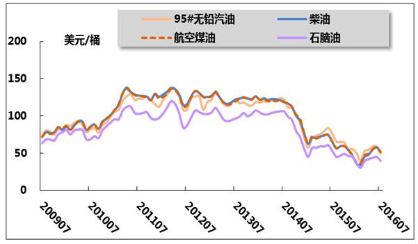 2009年7月-2016年7月国际主要成品油月平均价格走势图